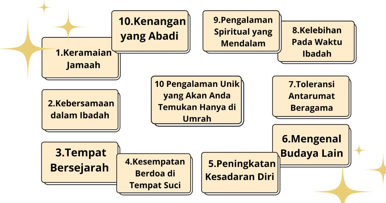 Umrah adalah salah satu perjalanan spiritual yang sangat penting bagi umat Muslim di seluruh dunia. Selain menjadi ibadah yang penuh berkah, Umrah juga memberikan pengalaman unik yang tidak dapat Anda temui di tempat lain. Berikut adalah 10 hal unik yang hanya Anda temui saat melaksanakan Umrah.